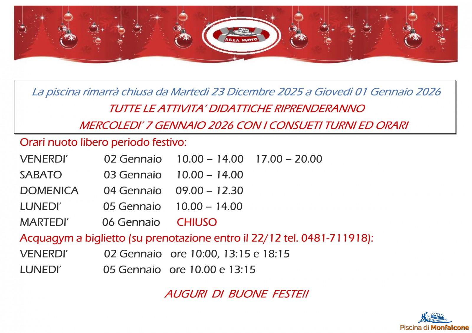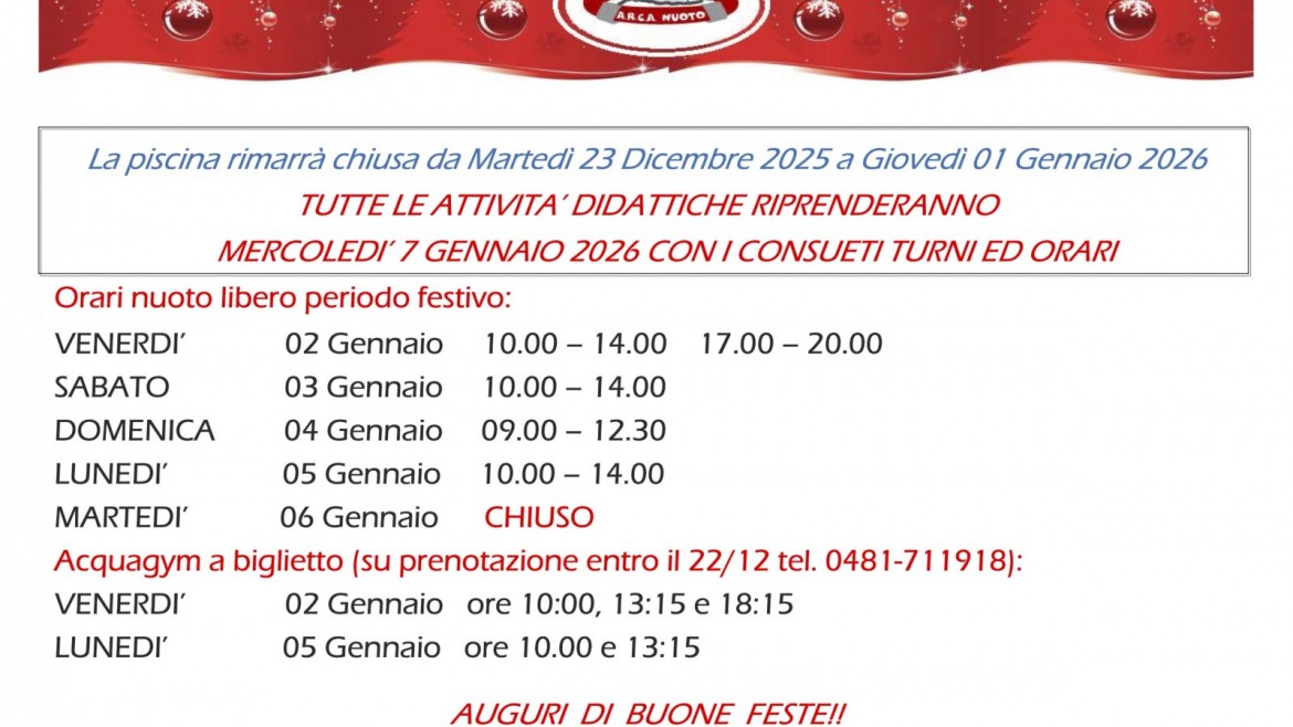 Sospensione attività didattiche. Programma nuoto libero, acquagym Festività Natalizie 2025. Articolo del 18/12/2025 ‹ › × × Commenti Abilita JavaScript per visualizzare i commenti tramite Disqus.